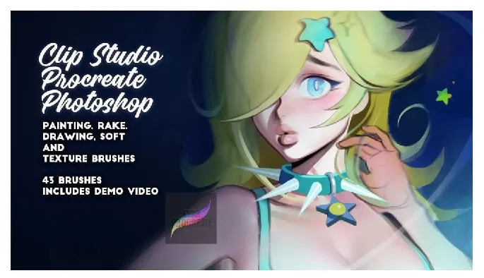 The stunning character illustration in the preview—featuring soft lighting and smooth skin tones—demonstrates the “Soft” and “Painting” brushes in action, while the hair details showcase the precision of the “Rake” tools. To help you get the most out of these tools, the download even includes a demo video, guiding you through the best ways to use them for character art and shading.