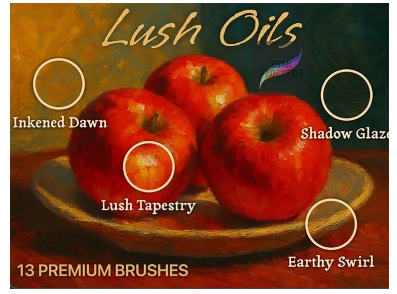 As demonstrated by the stunning still life of apples in the preview, these 13 premium brushes allow you to build up rich layers of color that look wet and heavy. The set includes specialized tools like “Lush Tapestry” for creating bold, textured strokes that mimic the weave of canvas, and “Shadow Glaze” for adding subtle, transparent depth to your darker values.