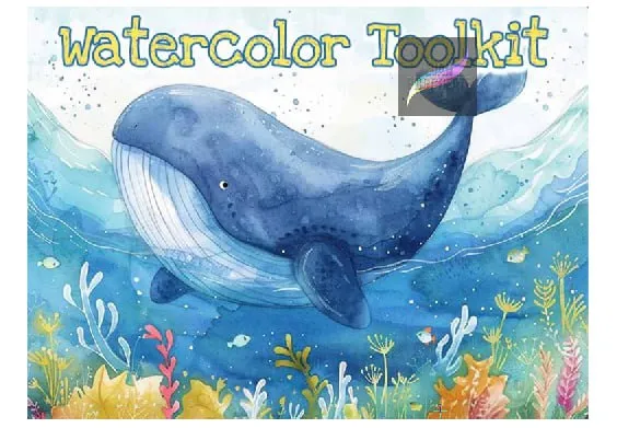 As showcased in the charming preview, this toolkit is perfect for nature and animal illustration. The sample artwork features a gentle blue whale swimming through a vibrant underwater garden, demonstrating the set’s ability to handle both large washes and fine details. You can see the beautiful blending on the whale’s belly, mimicking the way pigment naturally diffuses on wet paper.