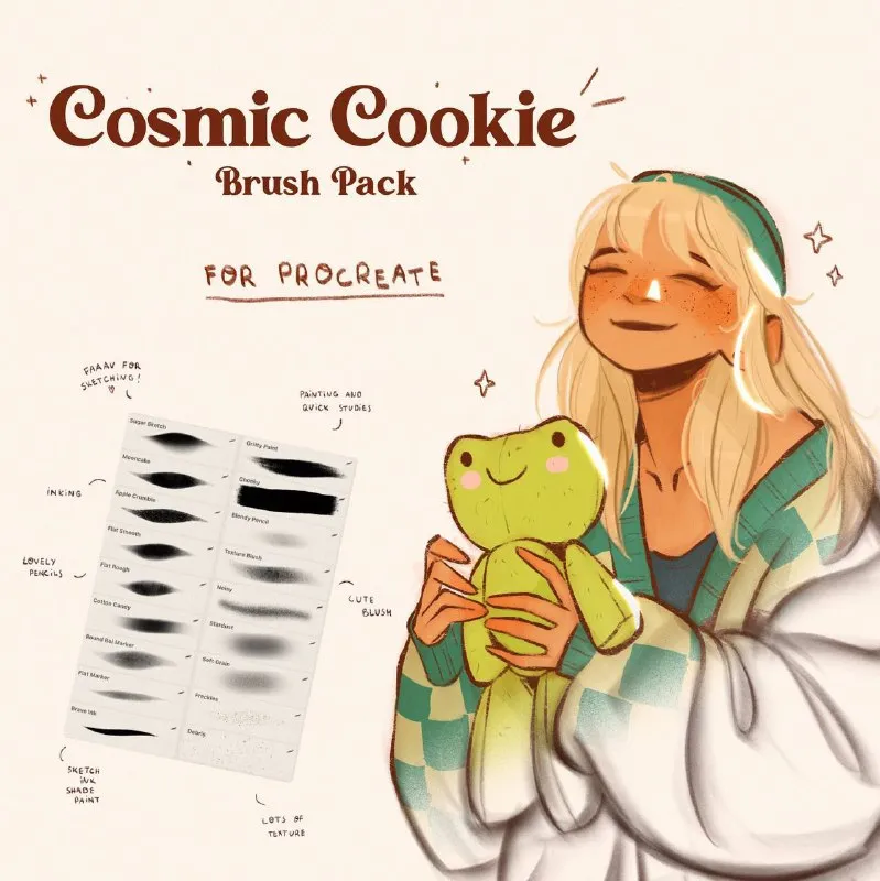 Download the “Cosmic Cookie” pack! Includes pencils, texture tools, and sketch ink brushes for procreate for cute art.